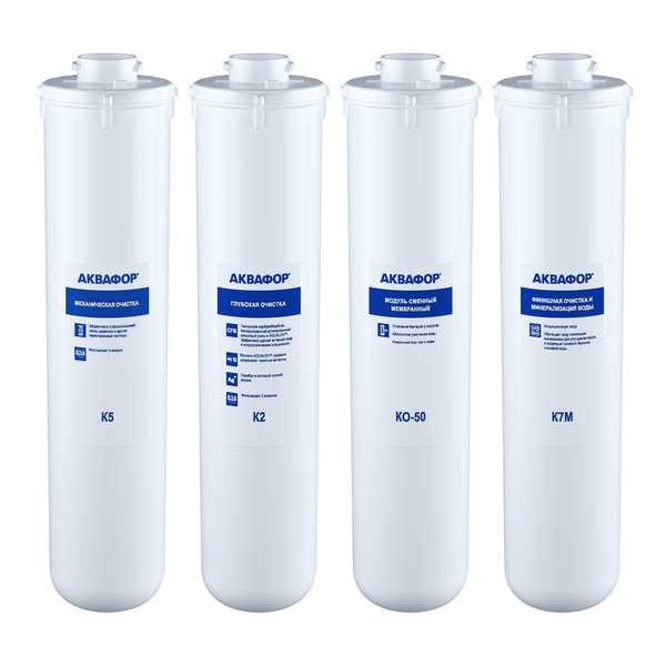 Комплект модулей сменных фильтрующих Аквафор К5-К2-КО-50-К7М подходит для фильтров Аквафор Морион DWM-101, DWM-70, Аквафор-ОСМО-50К, DWM-41 и используется для очистки холодной воды.