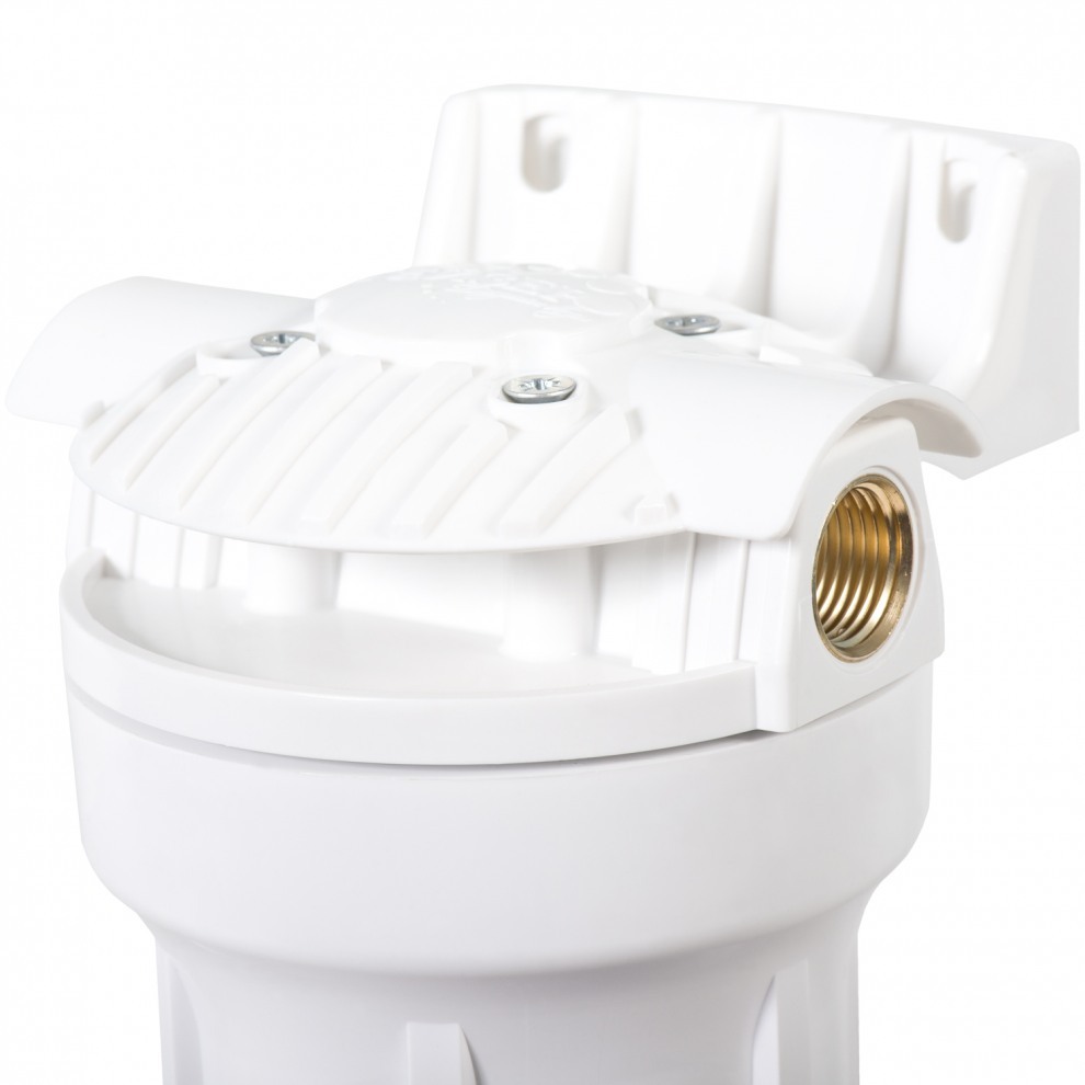Корпус Гейзер 10SL изготовлен из белого полипропилена с латунными вставками и пластмассовой скобой . Корпус рассчитан на работу под давлением и установку на входе в систему холодного водоснабжения.