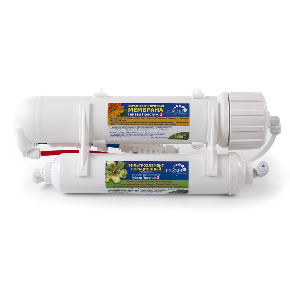 Технология обратного осмоса, использованная в фильтре Гейзер Престиж 2, заключается в фильтровании воды через полупроницаемую мембрану. Размеры пор мембраны настолько малы, что пропускают только молекулы воды. Размер молекул большинства примесей, а также бактерий и вирусов значительно больше молекул воды, поэтому они не проходят через мембрану. Специально разработанный блок предочистки позволяет очищать воду с высоким содержанием солей жесткости и растворенного железа.