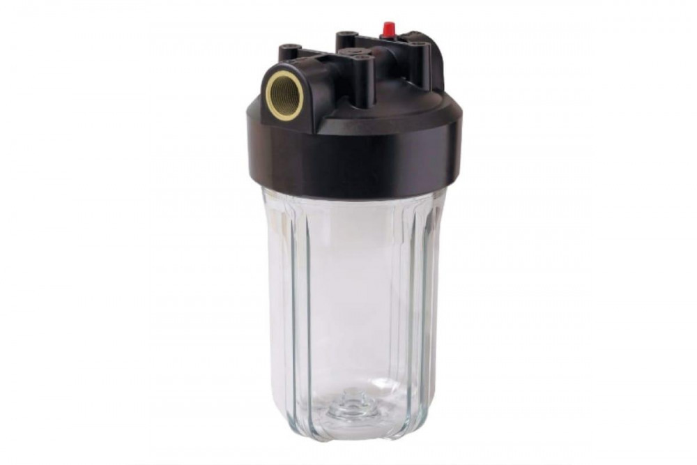 Корпус магистрального фильтра Гейзер 10BB прозрачный, с латунными вставками  устанавливается в магистраль холодного водопровода дач, квартир или домов.
